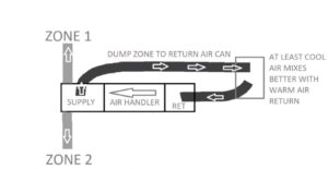 If one zone is open and the other closed, the extra air gets sent through an 8 to 12” inch duct, immediately back to the return plenum and mixes with that 65-degree air. Essentially raising the return air temperature to 70 to 75-degrees.