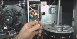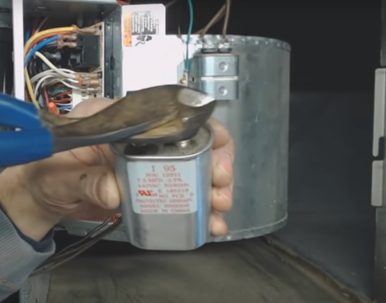First, make sure the power is off to your furnace. Not just on your door switch, make sure the main power is off, you going to isolate your capacitor – take that off.