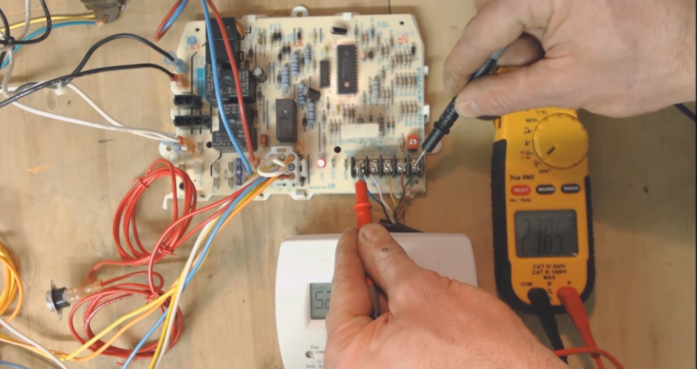 So, you just need to make sure that you have 24 volts going to the board to tell it to turn on, in this case, we can test the 120 volts coming off of the control board to our blower motor.