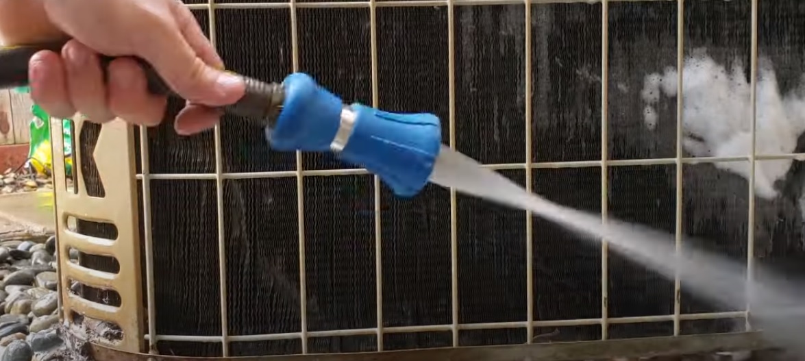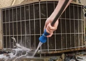 Please don’t use a pressure washer. You will destroy the parts of the system that are crucial for airflow and heat transfer. But you do want to use just enough pressure from the hose to start knocking off loose dirt and small debris down to the ground.